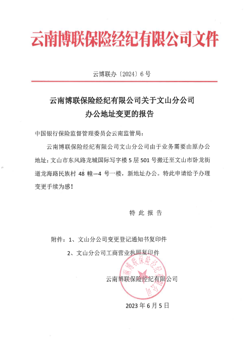 云南博聯(lián)保險經(jīng)紀(jì)有限公司關(guān)于文山分公司辦公地址變更的報告