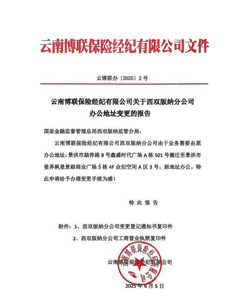 云南博聯(lián)保險(xiǎn)經(jīng)紀(jì)有限公司關(guān)于西雙版納分公司辦公地址變更的報(bào)告